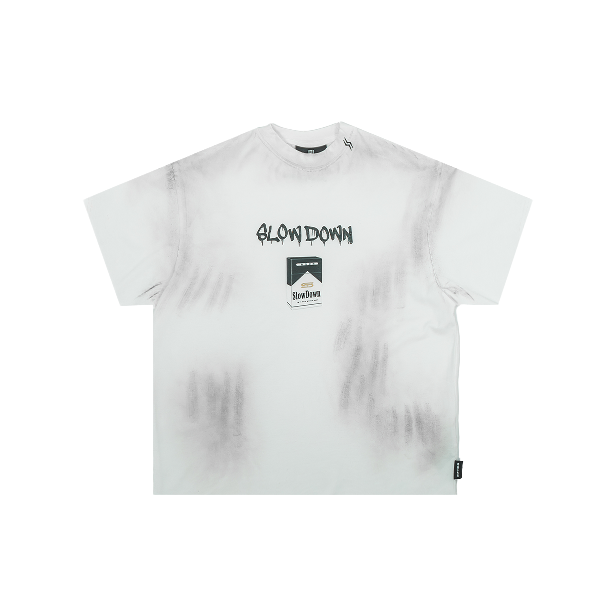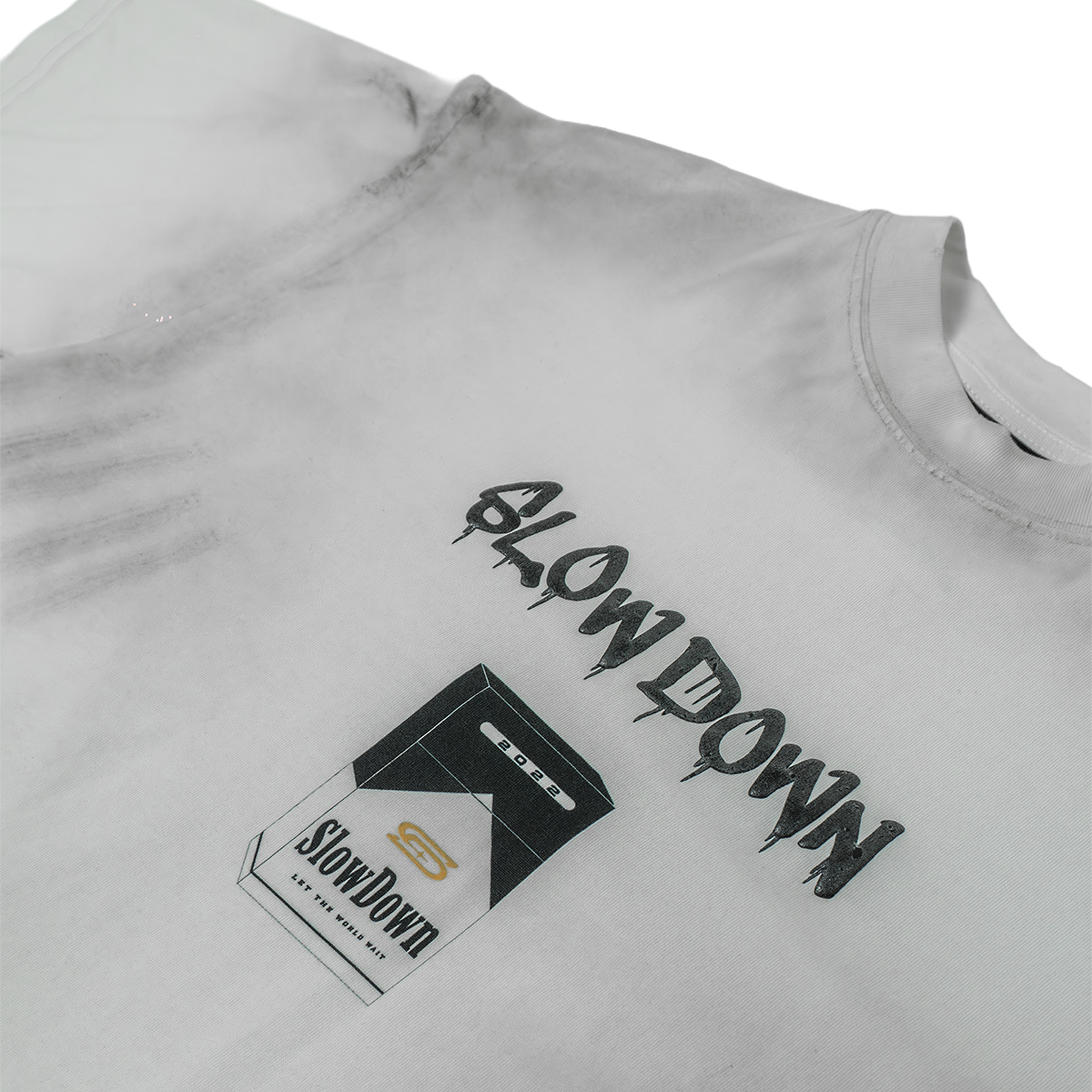 The SLOWDOWN Cig Box Tee features a unique dripping paint design that artfully highlights the iconic “slowdown” text, paired with a slow cigarette box graphic. Crafted on a durable 290 gsm fabric, this tee offers a substantial feel and lasting wear, making it a sophisticated choice for those who appreciate bold yet refined streetwear aesthetics.