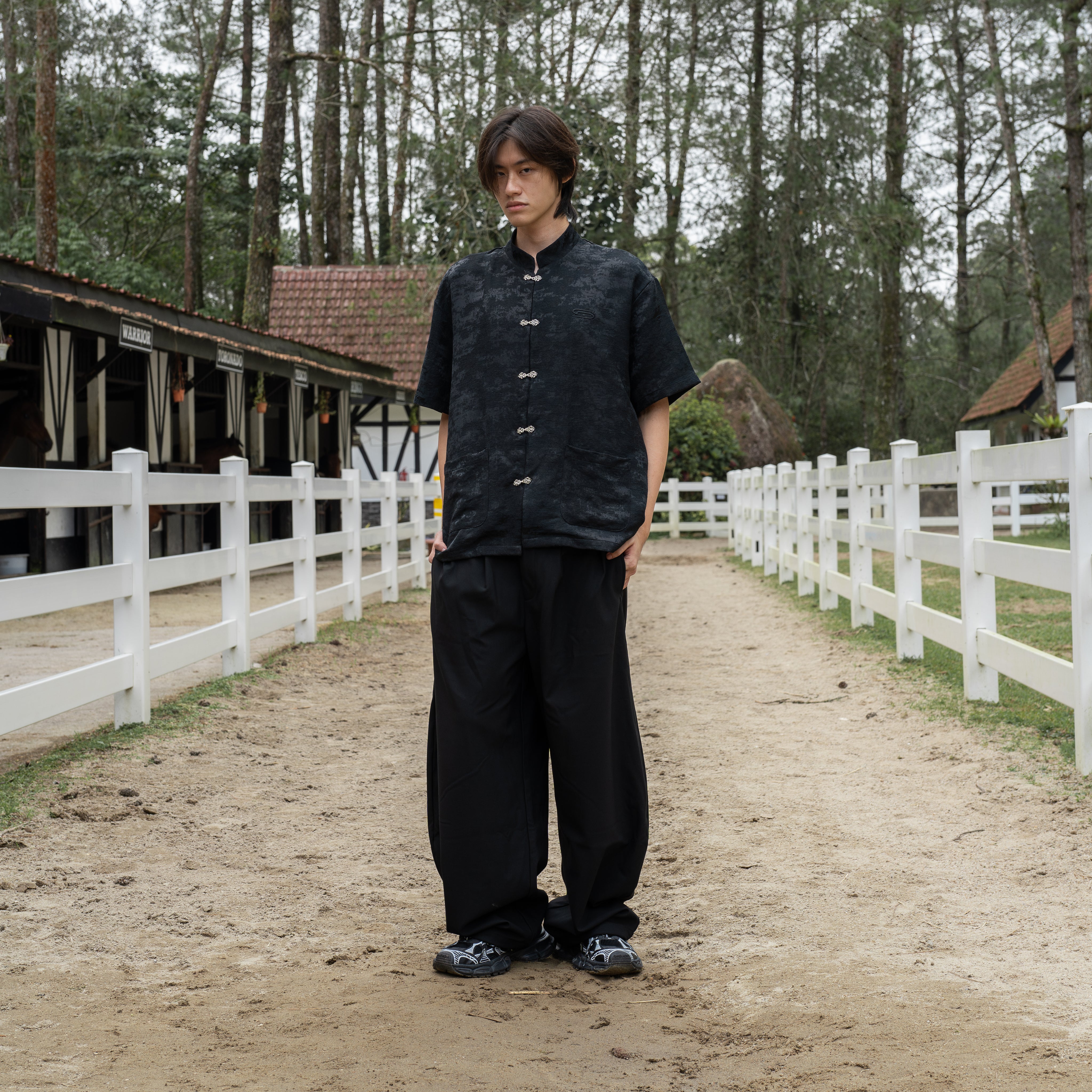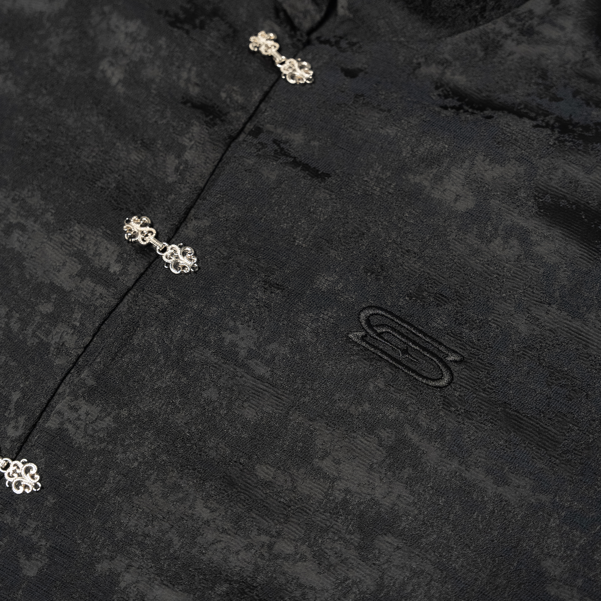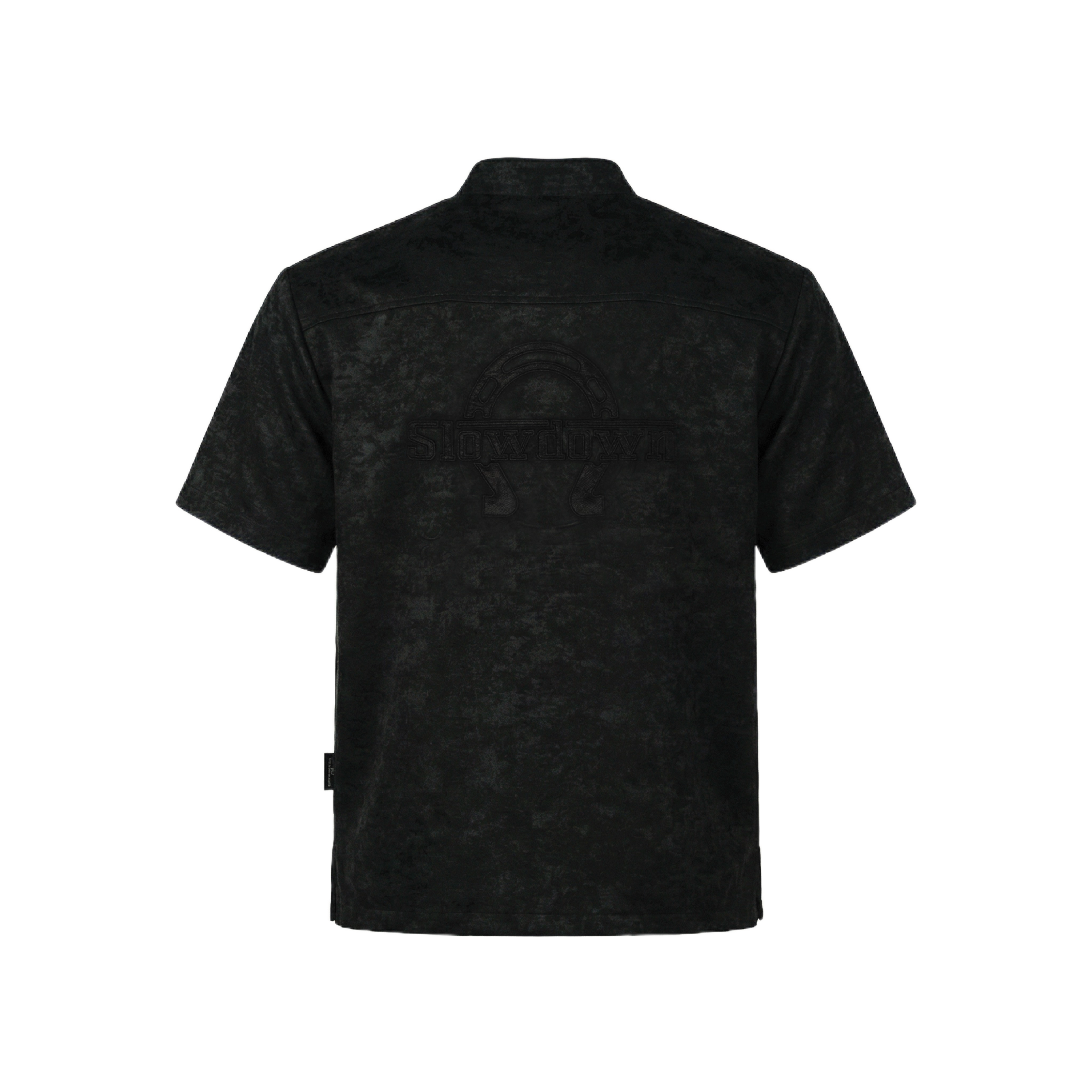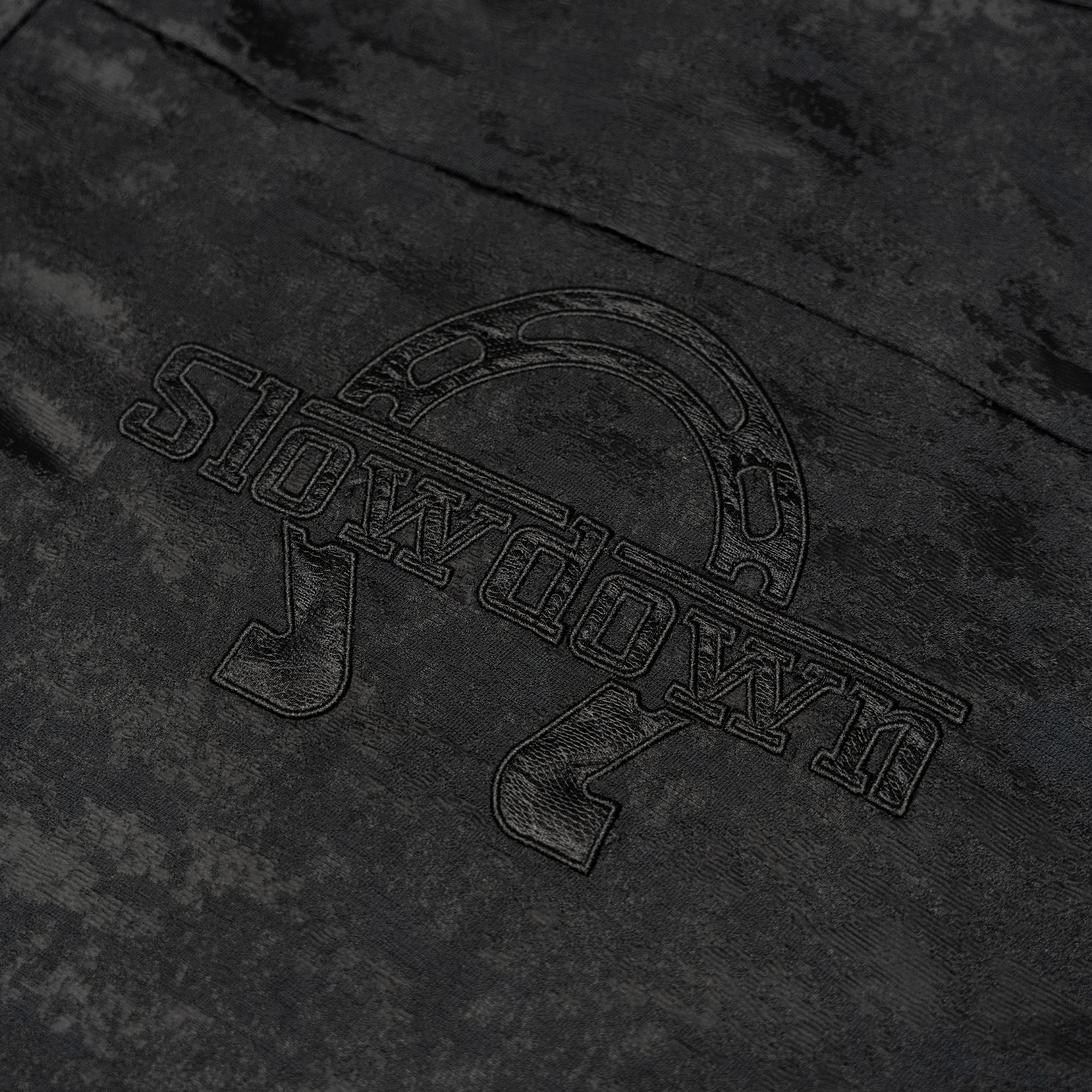 SLOWDOWN Equine Tang Suit Black Crafted for those who demand both heritage and comfort, this short sleeve tang suit merges traditional tailoring with contemporary ease. Premium fabrics drape with refined structure while maintaining breathability for all-day wear. Jewellery inspired tang hooks replace standard closures, elevating the silhouette with distinctive character. Intricate lace embroidery traces an elegant equine shoe motif across the back, complemented by subtle SLOWDOWN branding.