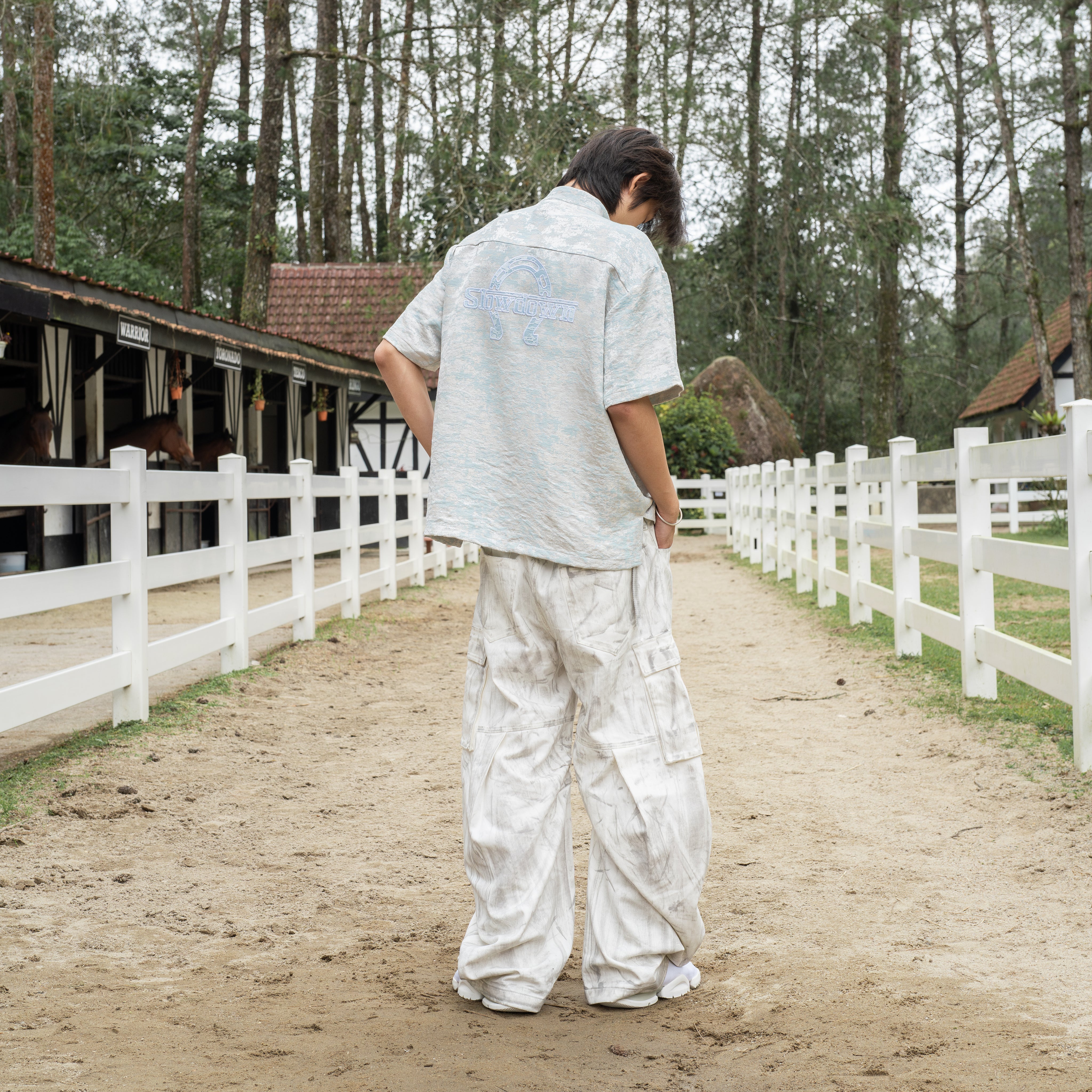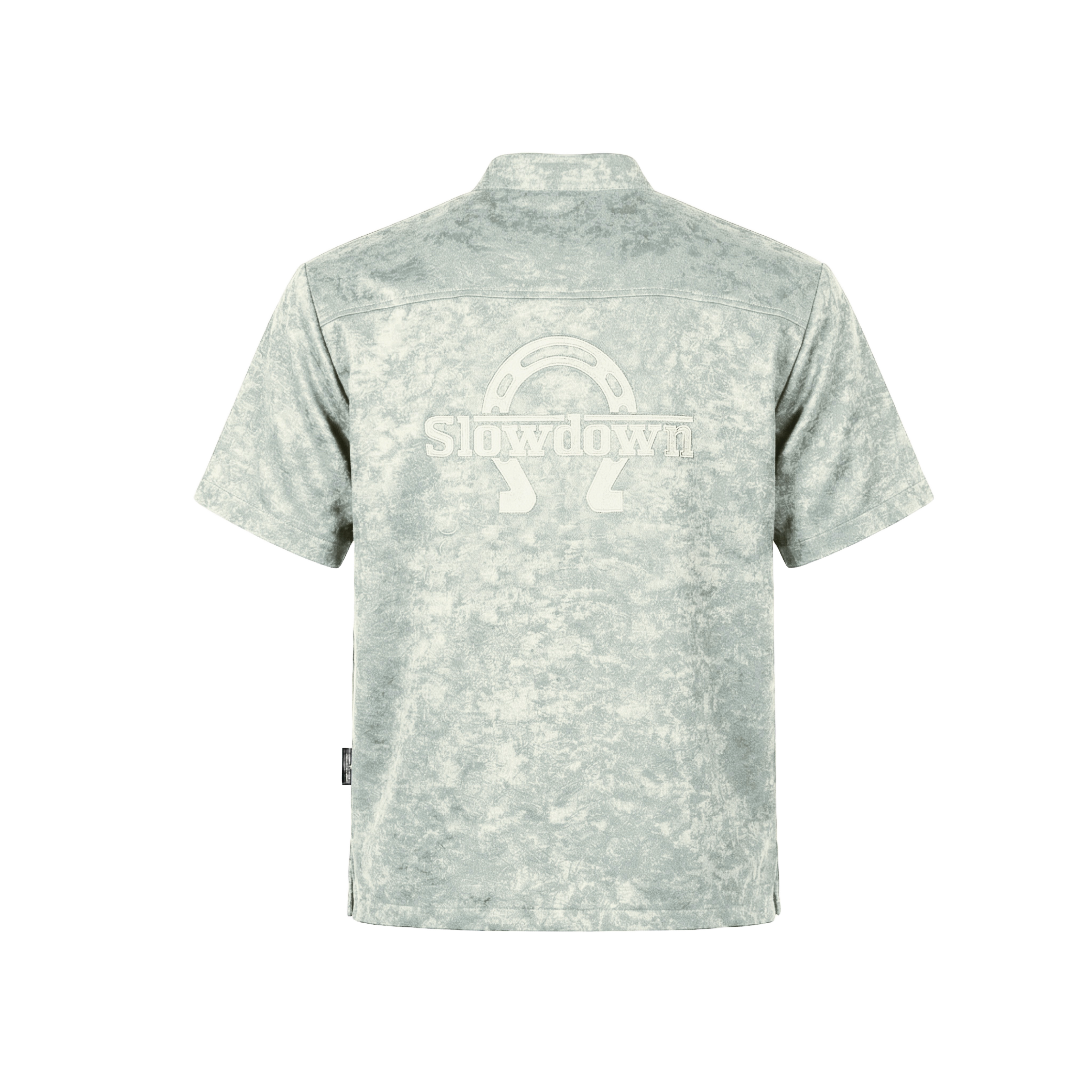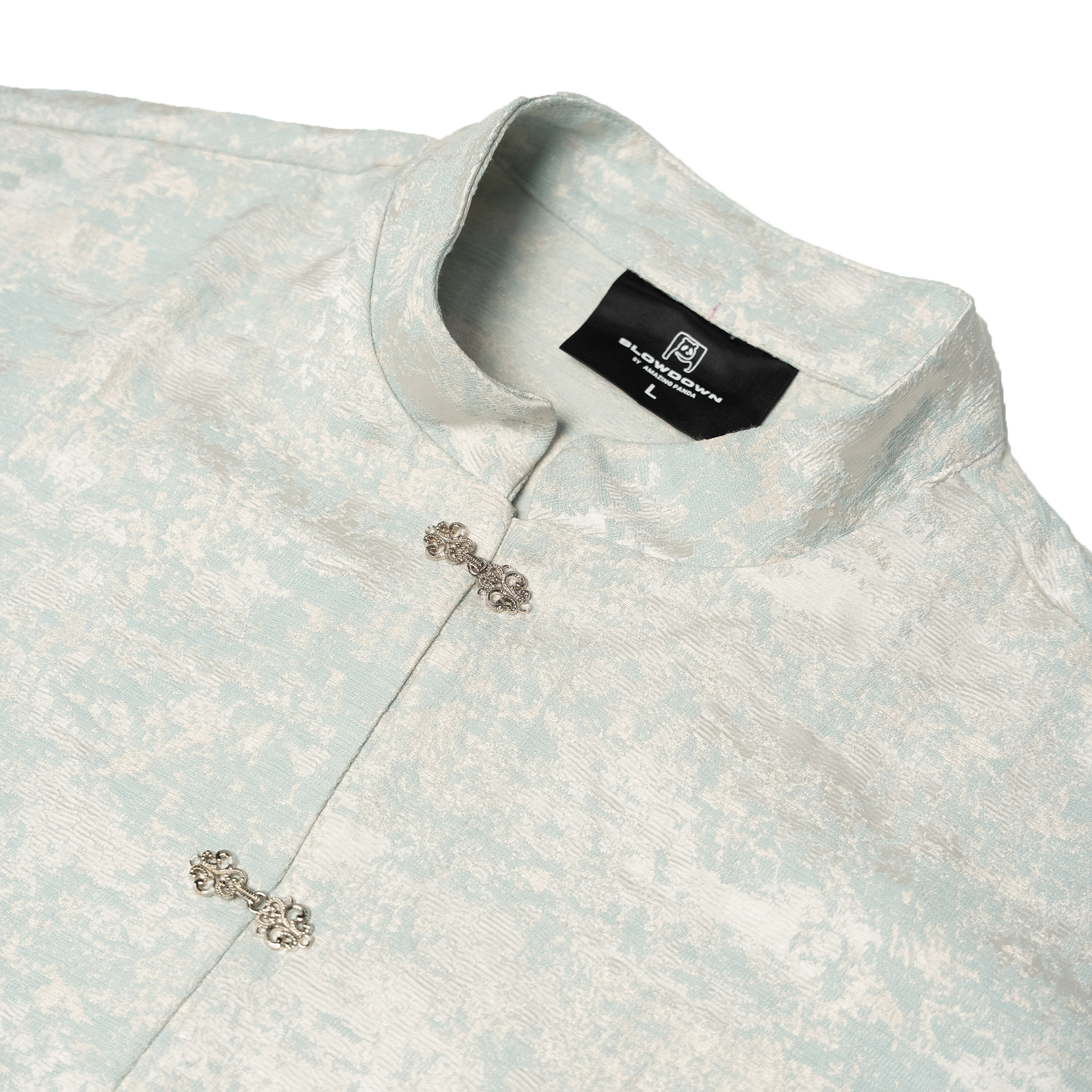 SLOWDOWN Equine Tang Suit Light Blue Crafted for those who demand both heritage and comfort, this short sleeve tang suit merges traditional tailoring with contemporary ease. Premium fabrics drape with refined structure while maintaining breathability for all-day wear. Jewellery inspired tang hooks replace standard closures, elevating the silhouette with distinctive character. Intricate lace embroidery traces an elegant equine shoe motif across the back, complemented by subtle SLOWDOWN branding.