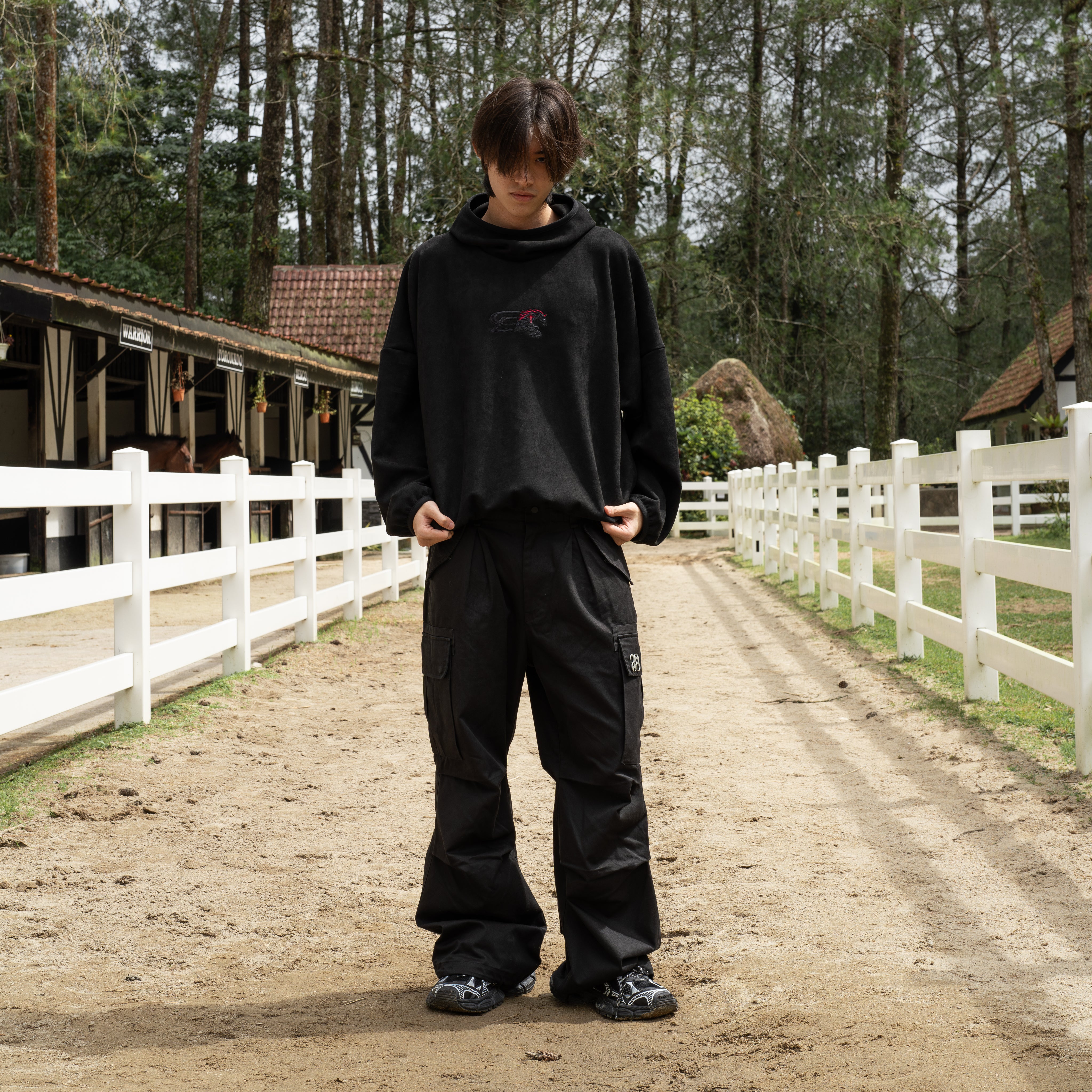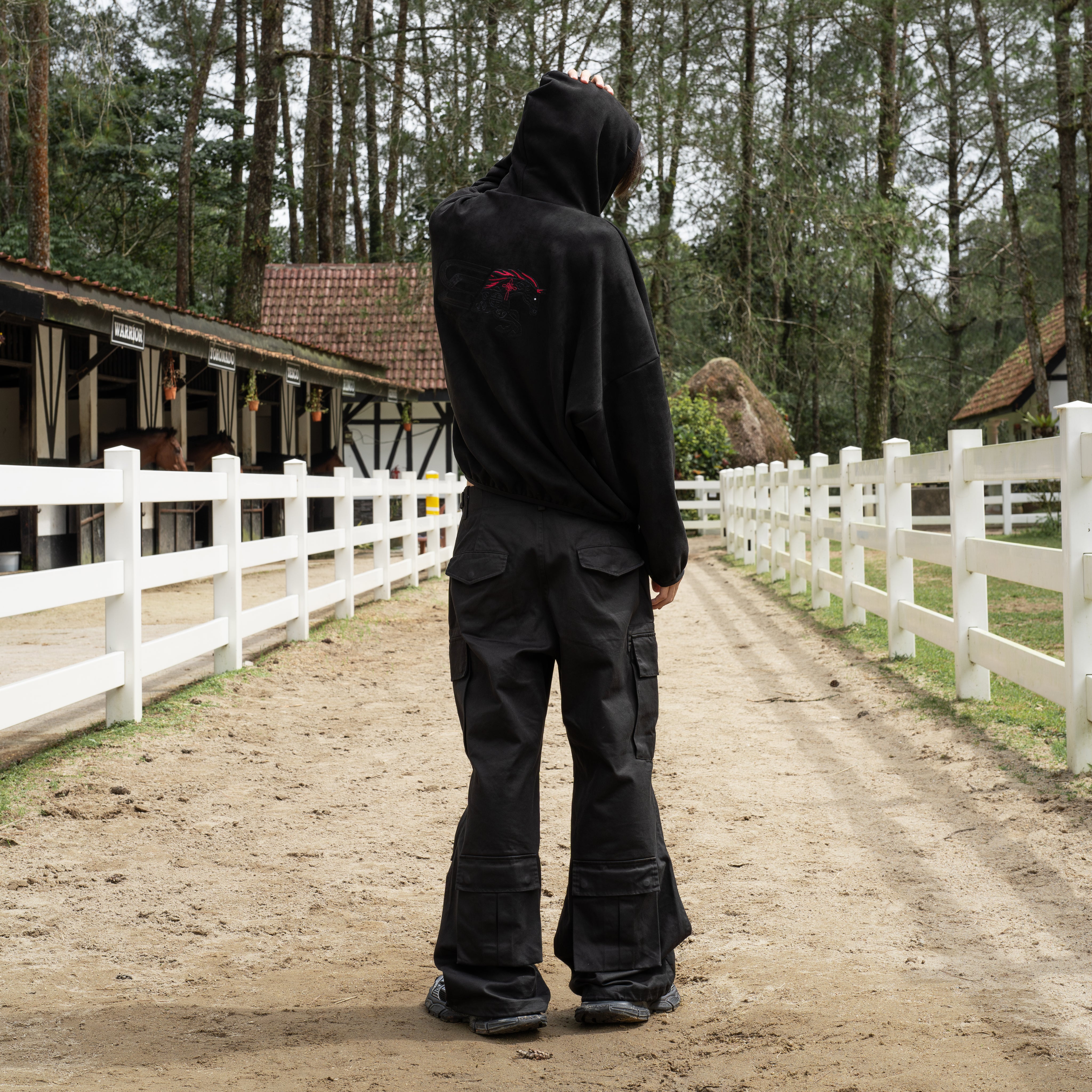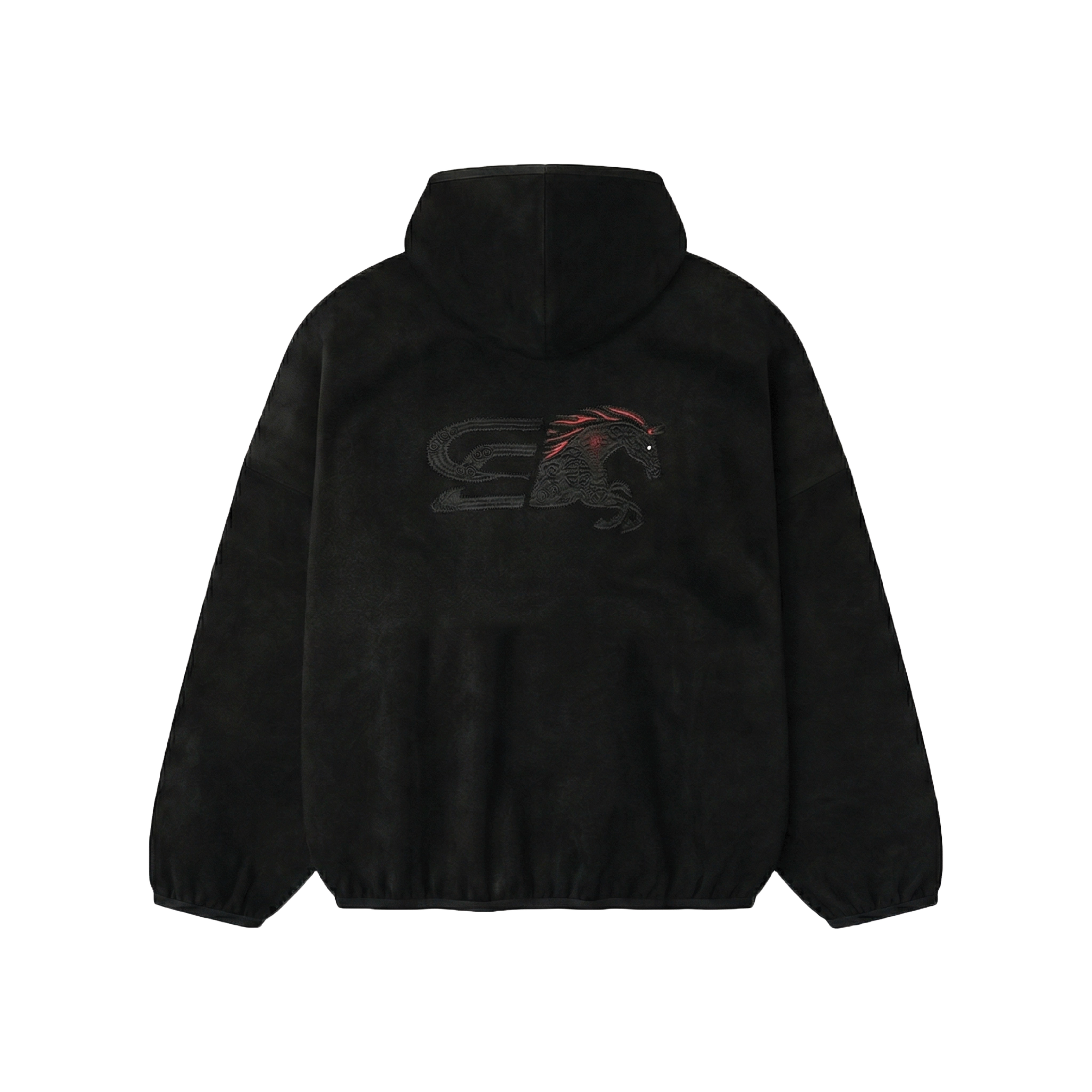 SLOWDOWN Logo Merge Hoodie merges our signature logo with an embroidered horse motif and traditional Chinese knot detailing. Crafted from premium cashmere imitation, with a tailored hooded high neck cover, this hoodie features meticulous red and black thread embroidery that elevates everyday wear. Keeps warm and but still light weight.