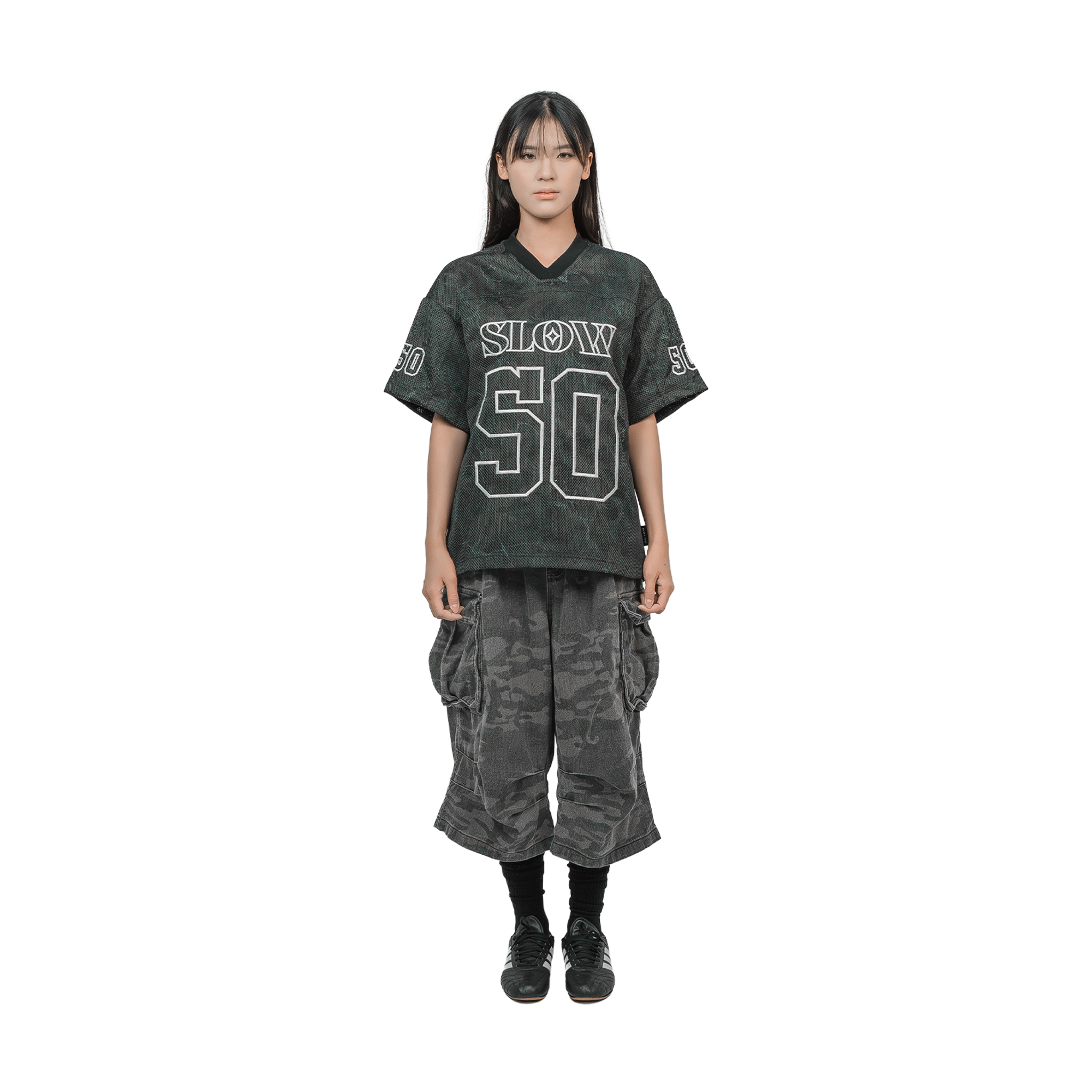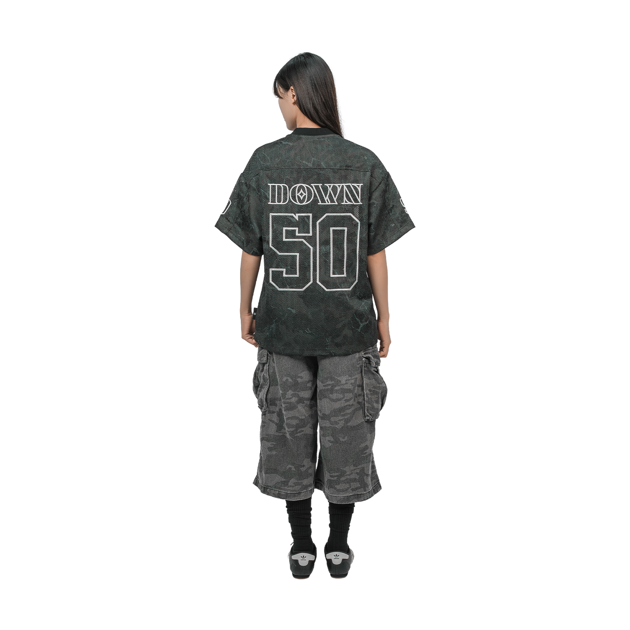 The SLOWDOWN Shadow Camo Jersey combines subtle shades of grey and shadow effects to elevate a classic mesh fabric into a sophisticated camo design. Featuring intricate embroidery and a metal tag logo, this jersey delivers an expert blend of style and detail. The embroidered branding on the back adds a refined finishing touch, making it an elevated choice for those who appreciate craftsmanship and understated urban appeal.